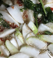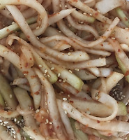 5. 물을 빼고 시래기를 잘라 마늘, 된장, 고추 넣고 조물조물 버무린다.