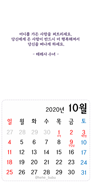 오늘은 아주 많이 늦어버린 10월 스마트폰 달력 배경화면을 공유드립니다.
