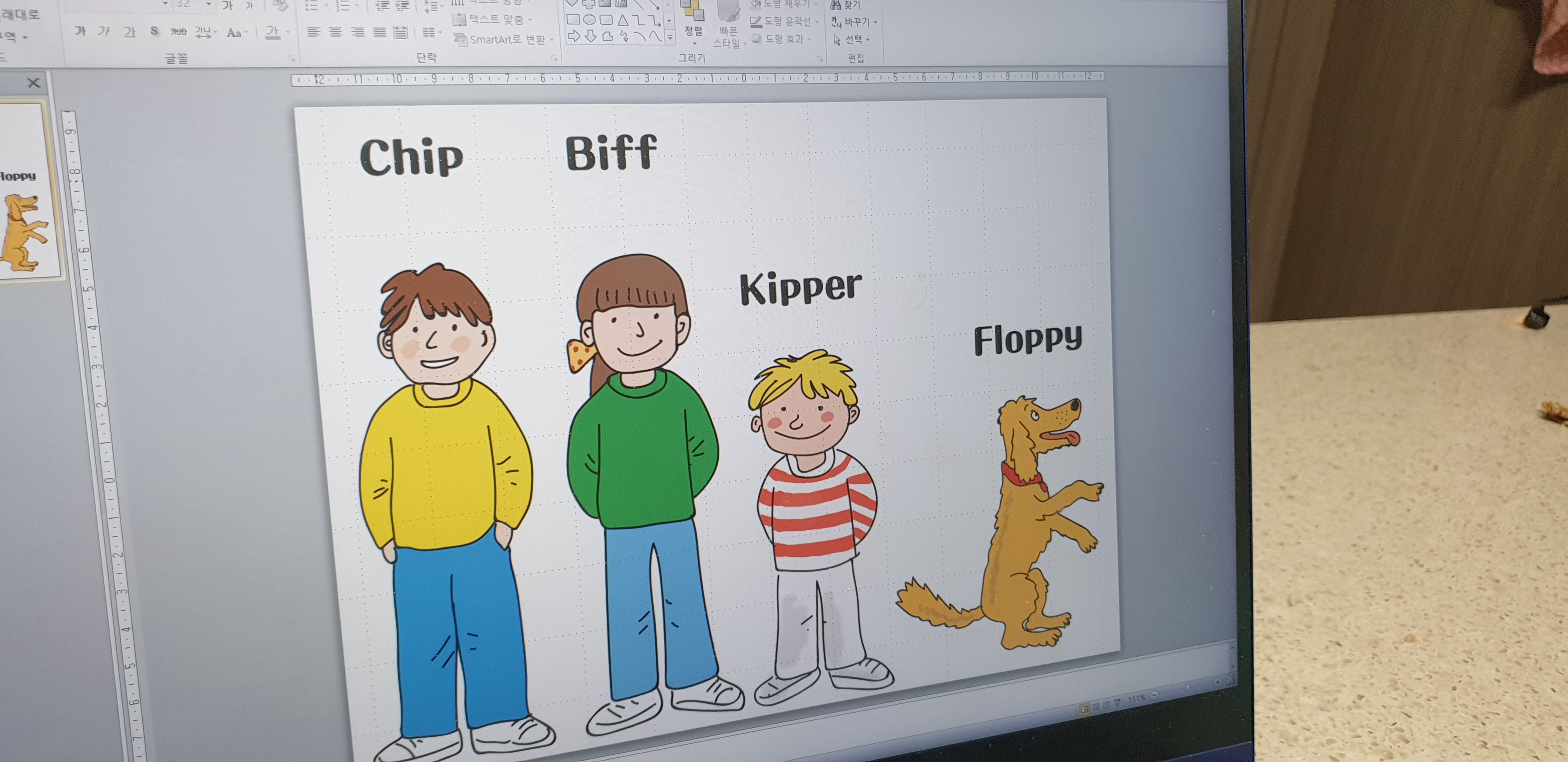 인터넷에서 Biff, Chip, Kipper, Floppy 그림을 찾아서 비슷하게 따라 그리고 출력해가지고 블록 앞에 붙인게 다입니다.