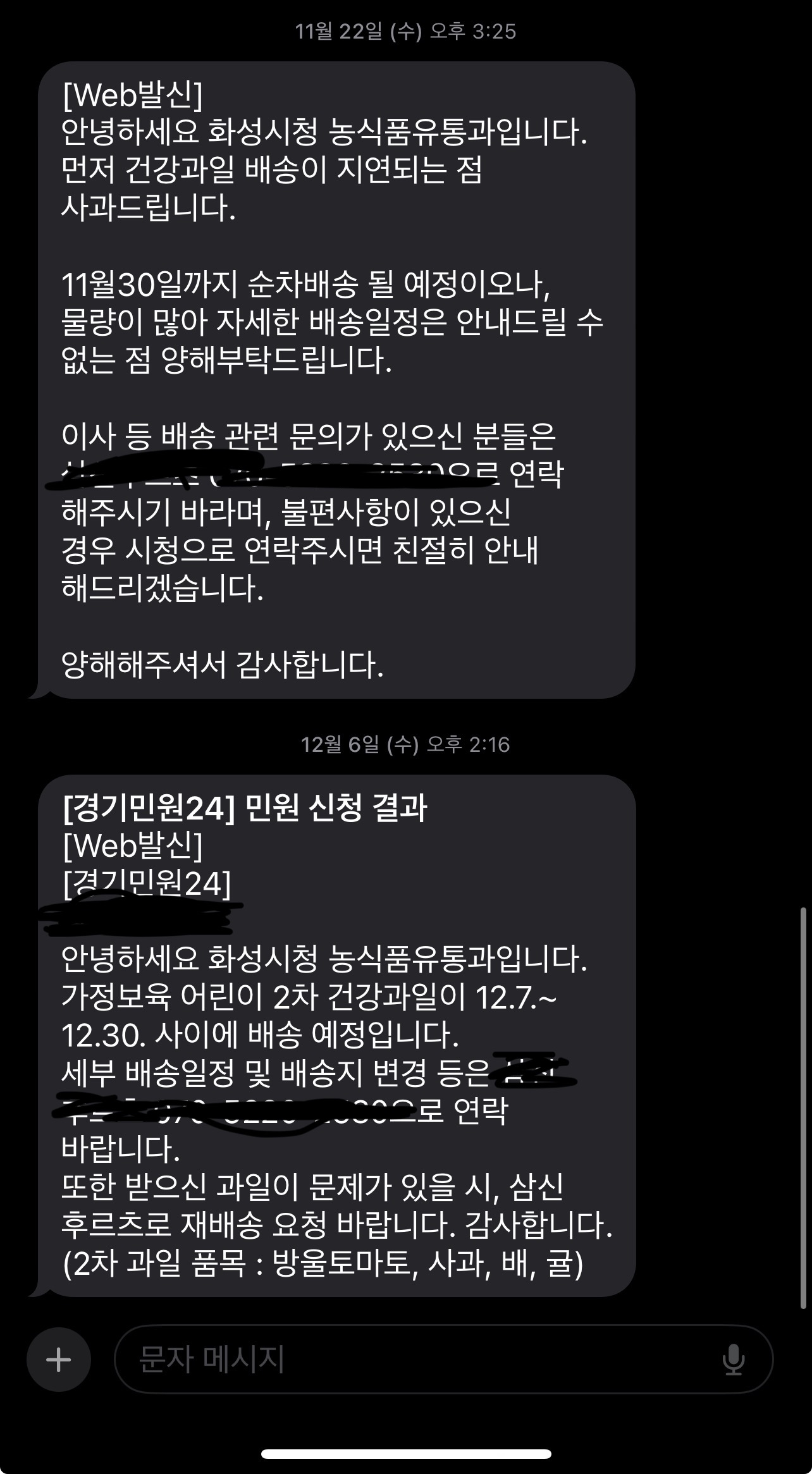 전에 코로나 기간때 한번 받았던 기억이 나는데, 가정보육을 하고 있는 어린이에게 과일을 지원해줬던 적이 있는데.. 이번에도 가정보육중인 둘째를 대상으로 과일꾸러미 세트를 받았다.